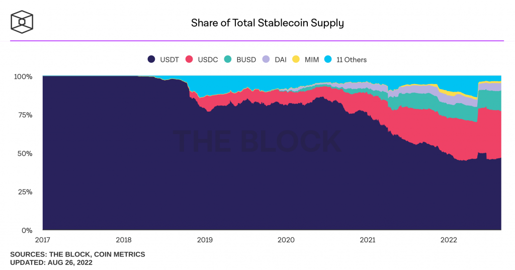 For example: If an issuer has $10 million of fiat currency, it can only distribute 10 million stablecoins, each worth one dollar. Some of the biggest stablecoins in this category by market value include Tether (USDT), the Gemini Dollar (GUSD), True USD (TUSD), and Paxos Standard (PAX).